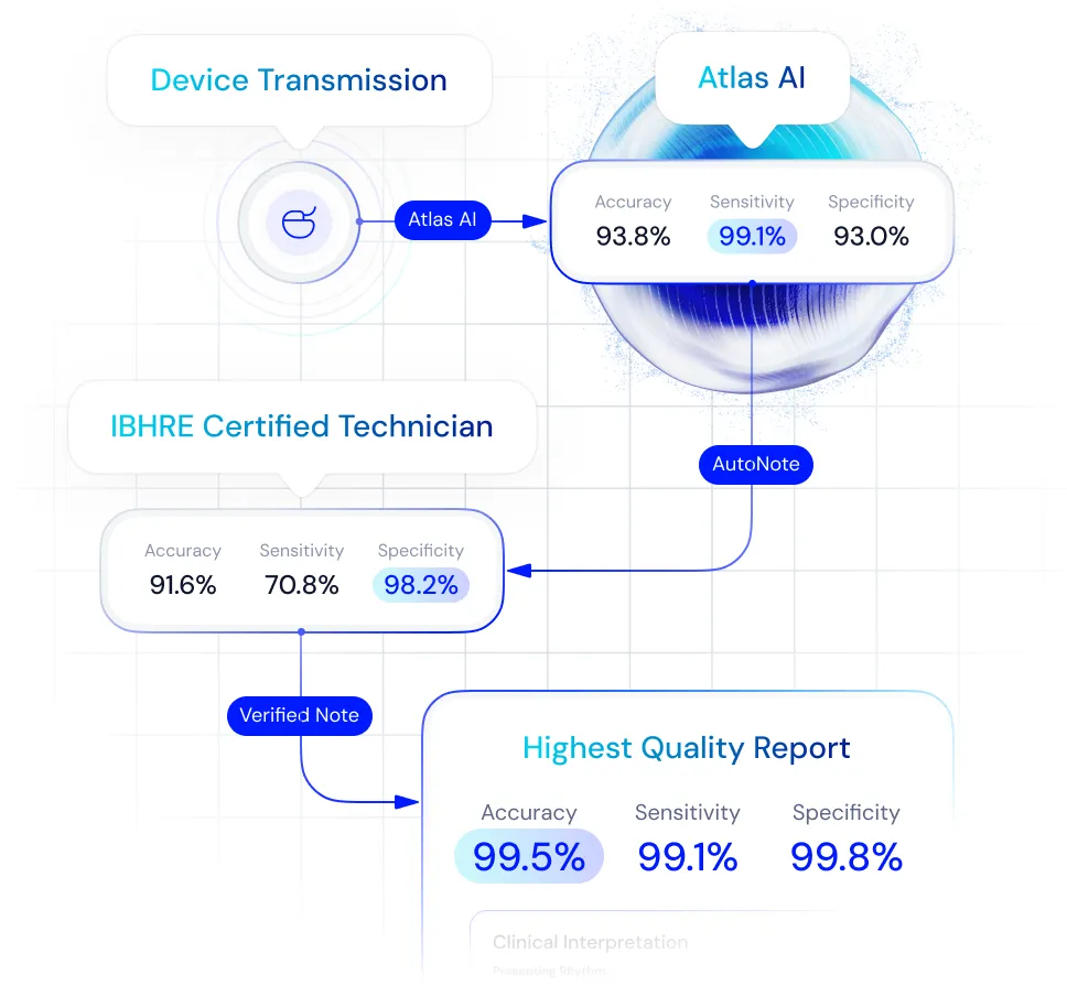 Our Atlas AI™ platform triages cardiac device transmissions to filter nonactionable alerts and highlight only the events that require true clinical attention. Through our Two-Brain Approach™ combining Atlas AI with IBHRE-certified cardiac device specialist oversight, Octagos delivers 99%+ accuracy, sensitivity, and specificity for near-perfect clinical performance.